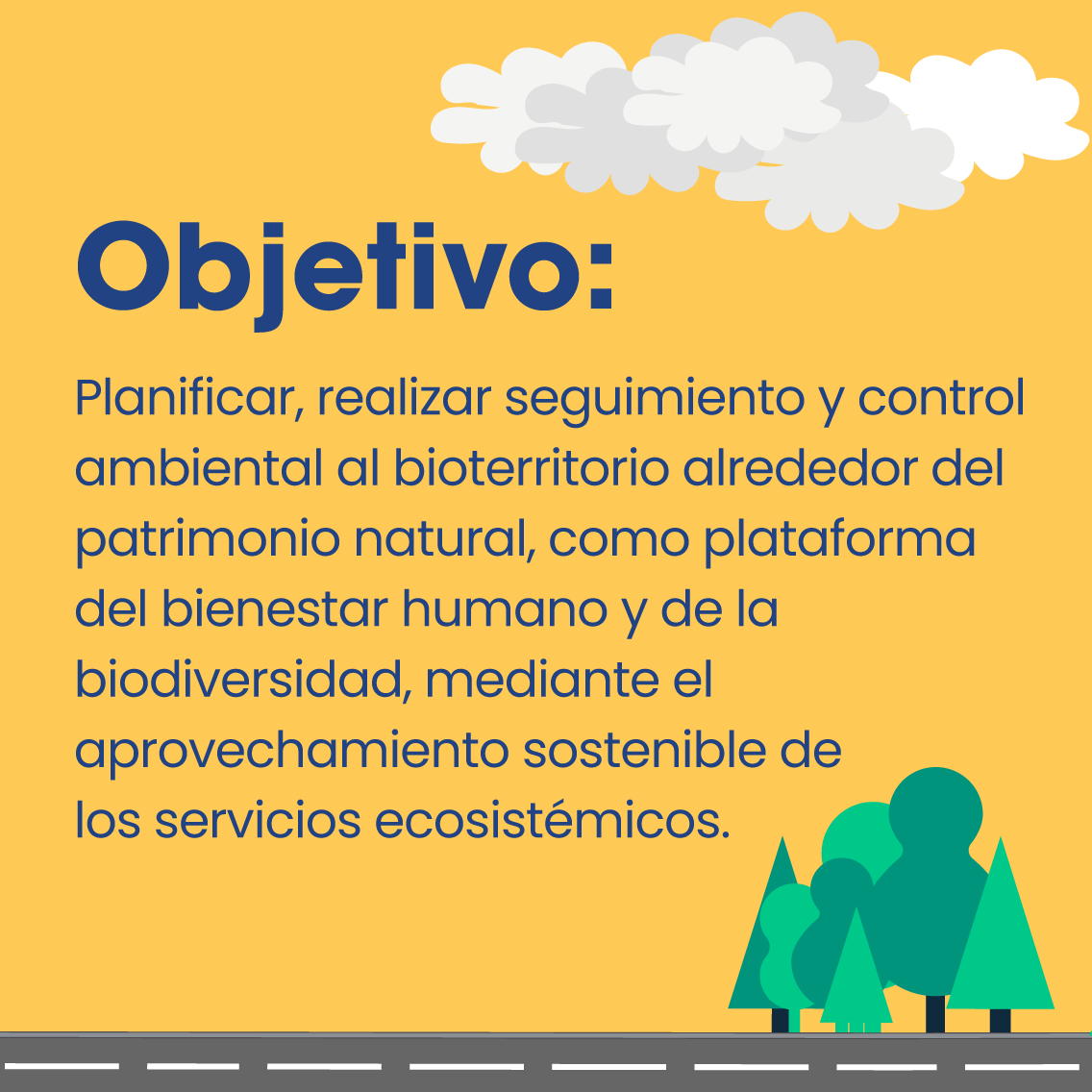 Planificar, realizar seguimiento y control ambiental al bioterritorio alrededor del patrimonio natural, como plataforma del bienestar humano y de la biodiversidad, mediante el aprovechamiento sostenible de los servicios ecosistémicos.
