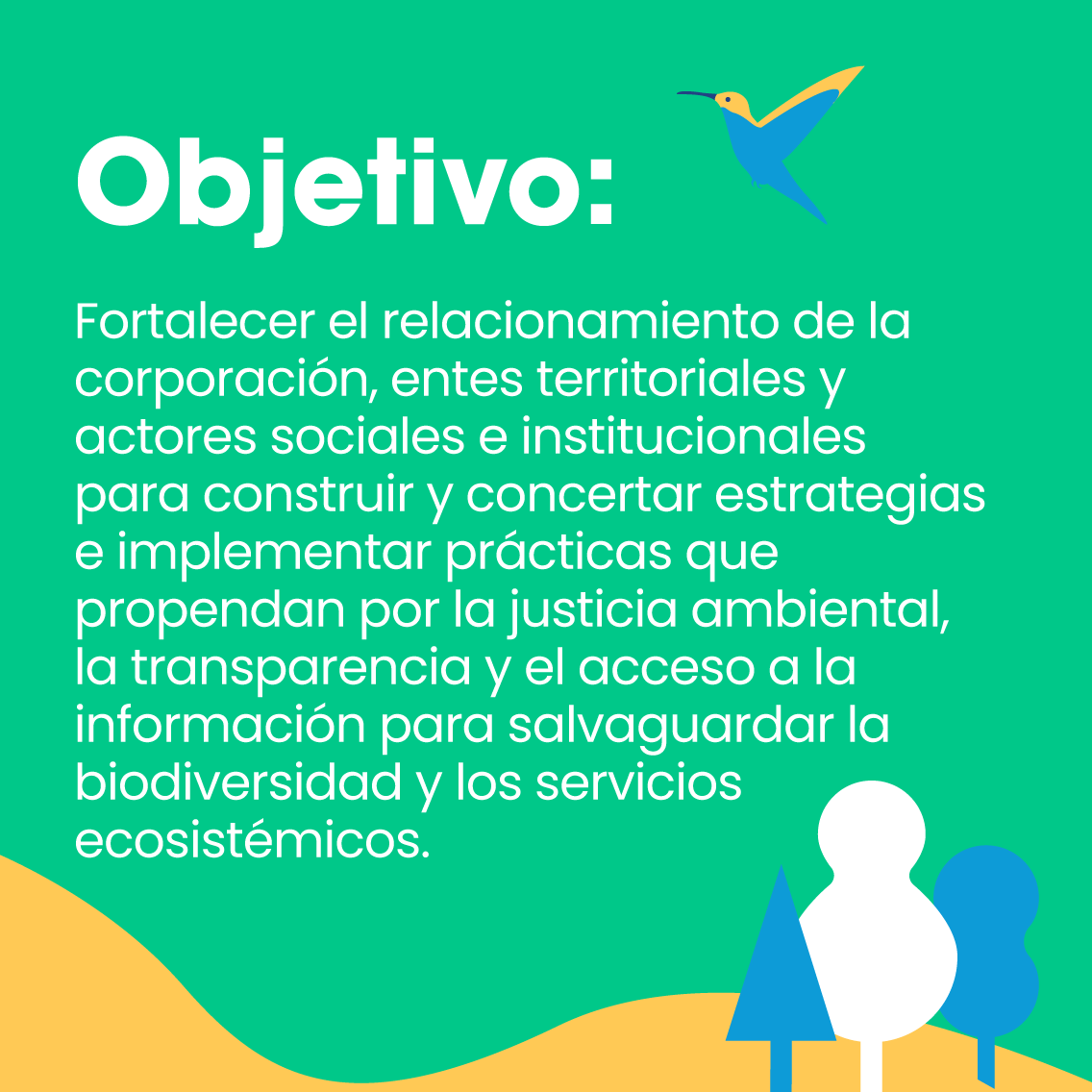Fortalecer el relacionamiento de la corporación, entes territoriales y actores sociales e institucionales para construir y concertar estrategias e implementar prácticas que propendan por la justicia ambiental, la transparencia y el acceso a la información para salvaguardar la biodiversidad y los servicios ecosistémicos.